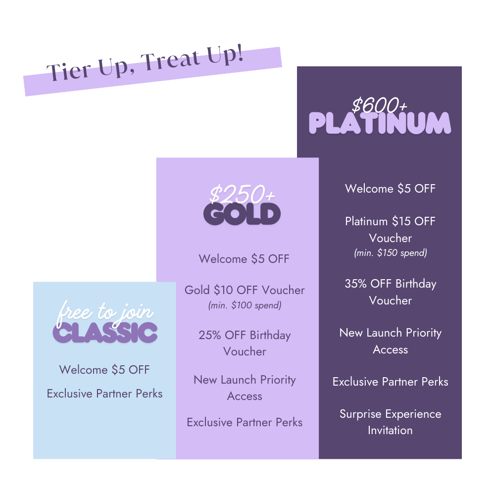 - Platinum: Spend an accumulated amount of S$600+ in your tier cycle