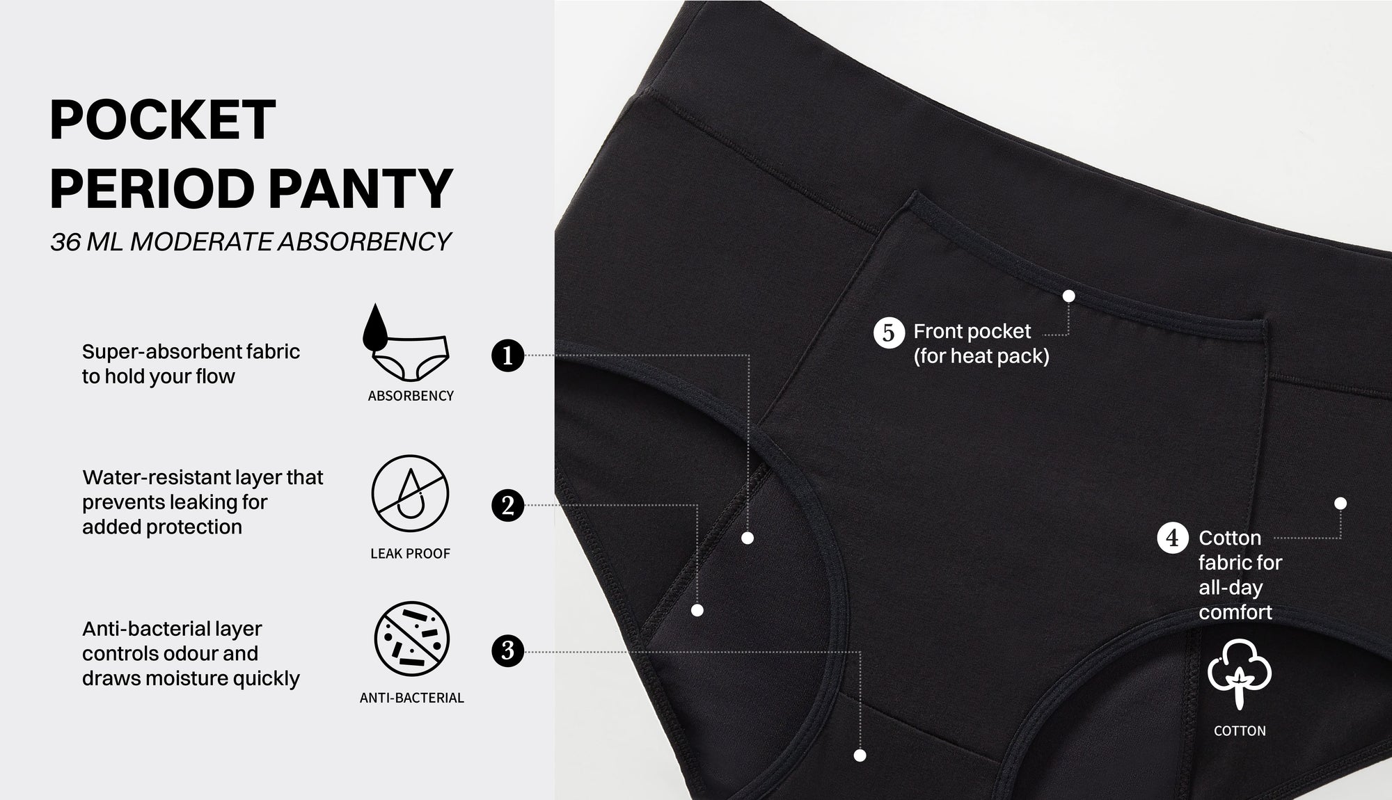 Period panties are highly absorbent panties, specially designed to replace single-use feminine care products such as sanitary pads and tampons.